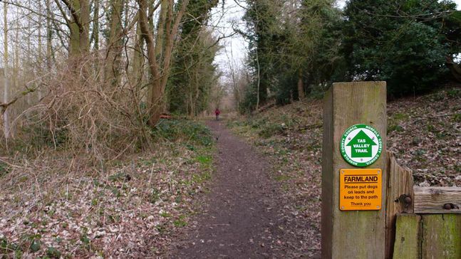 [1] Leave the car park and walk straight across the Common, between two clumps of bushes, to the road on the other side. Take the footpath, signposted Upper Tas Valley Walk, which passes to the right of Fairview House to the right of garage . After 100 yards the path turns right and goes over a stile into a paddock. Cross the paddock to another stile in the far left-hand corner. cross field to hedge follow to track turning left at waymarker bearing right at bottom of field. Where the path meets the road cross over and go through a wooden gate into a wooded area. If you do not wish to go through the paddock were there are loose horses cross the road from car park turn right till in line with the church left across the common over main road head towards a set of large metal gates path to the left follow hedge to the end were you turn right joining the main rout 6