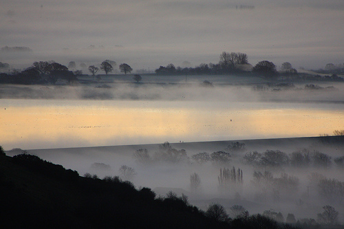 [8] Cross the bridge at the end of the track and pass through a kissing gate immediately on your left. Follow the River Yeo through two fields until you come to a bridge on the left. Pass over the bridge and immediately turn right through a metal gate, ignoring the drove straight ahead. Keep the river on your right until you reach a metal footbridge to take you back over the river. On the other bank, turn left and walk straight ahead until you reach yet another footbridge. Cross the footbridge and follow the drove ahead until you reach the southern edge of the reservoir.