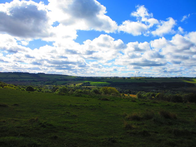 [9] When you exit the path through wooden poles, turn right to walk down the old quarry way. You will walk through woods and after a distance you will reach a field on your right. Walk further downhill and you will walk through fields on both your sides.