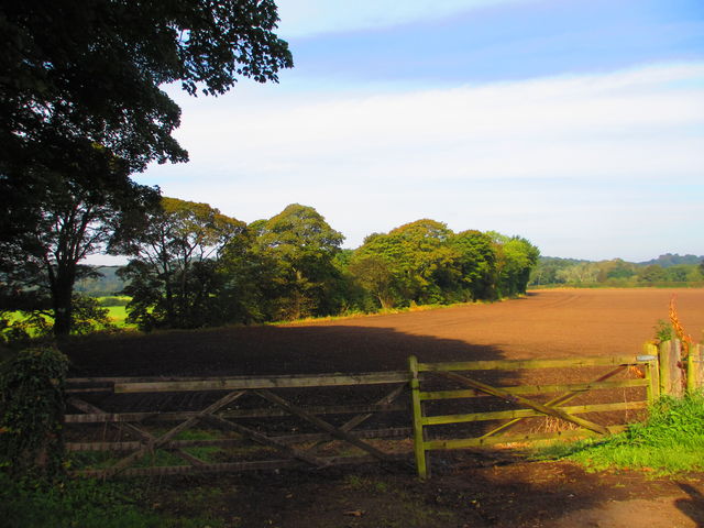 [4] In front of the woods, turn right to follow the path. It will lead you into the woods, where you will see a stile. Go around the stile and turn right to follow the path through the woods.
