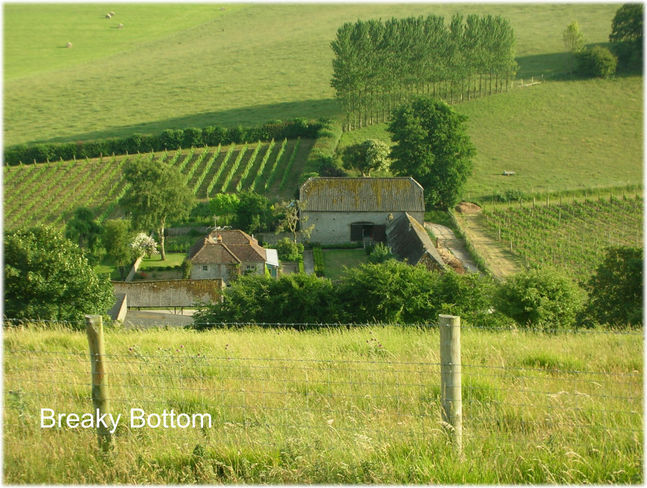(A) This is a lost and secluded part of the downs. Below you is the Breaky Bottom vineyard.  But such an idyll is not without its problems.  In recent years huge amounts of water and slurry have descended on the vineyard because the farmer of the land around it had planted winter crops so the water and earth ran down the hill rather than soaking in. It is not just townies who suffer from difficult neighbours.  But perhaps we may not feel too sympathetic.  The crossed out brown person is there because this is access land, but the vineyard owners have managed to convince the authorities that access should be denied because of the existence of a chalk pit on the site which people might fall into.  These pits are common on access land and, of course, nearby Seaford Head is still open.  When it was suggested that the pit could be fenced the reply was that fencing would be unsightly.  Note the large amount of new fencing elsewhere on this site. You can explore the access land to the right of the vineyard a little further on, and there are some lovely places there.