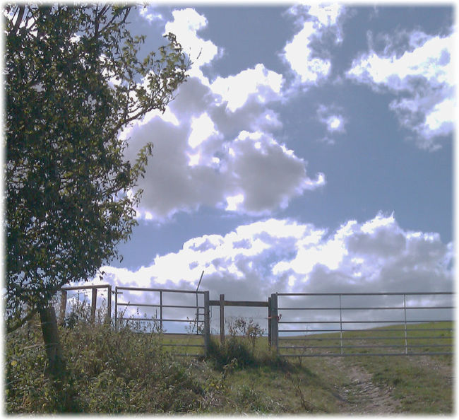 Climb the steps to emerge in a large field. Sometimes this field is ploughed over and planted with crops. Walk due south, aiming for a gate in the hedge about 40 metres from the road.