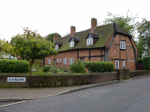 The Old Town Hall (Grade II listed) is the popular name for this building, although it never was the Town Hall, being a Constable's dwelling from 1520 until the 1800s. It was built around 1460, and is a fine example of cruck construction, in which the roof ridge is supported at each end on curved timbers split from a single oak tree trunk. The building is wood framed; the spaces between the timbers would originally have been filled with wattle and daub (mud supported by a frame of laths and woven reed). Repairs between 1625 and 1946 have replaced this by brickwork, so the timbers can only be seen on half the house. Note that the two parts of the house have two numbers, one for Slack Lane, the other for College Road.