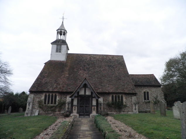 [2] Pass between the barns, and turn sharp left along farm track. After about 600 yards you reach wood on right and the finger-post pointing half left. Take this path, and head to gap in far left hedge. Follow a sign on the left and walk on edge of wood, and bear right along wood edge, to emerge on to road.Turn left, walk on, passing finger post to right, to reach Orchard Cottage. Soon after,follow a finger post to right indicating path south-eastwards towards wood. At the far corner at the wood edge a stile leads to path into wood (some bluebells) and emerges onto B1383 opposite Chequers Inn.