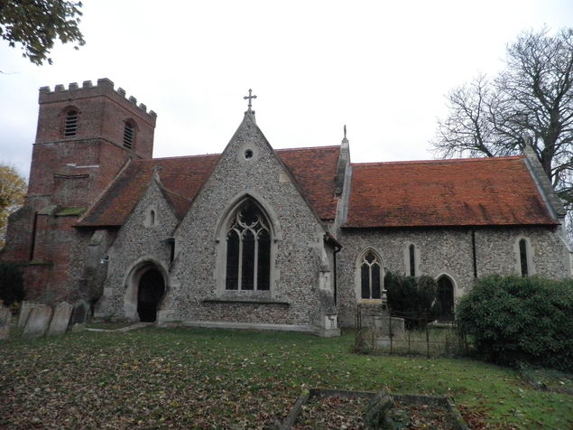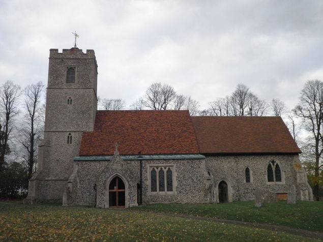 [1] Continue southward on the main road towards Rickling Green, ignore first footpath sign to left (soon after cottages), and go to the second signpost on the left, which has two arms. Take the path at right angles to the road, not the one going diagonally across the field.