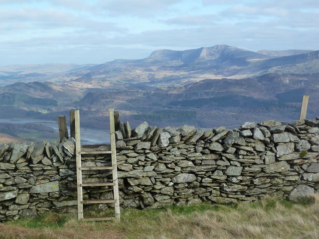[4] Go through the gate at the col and turn right. (The Ardudwy Way also crosses this col but carries on downhill.) With the wall now on your right, carry on up the ridge along a somewhat stonier path to reach the trig point. Continuing ahead, you’ll cross another stile. When you reach the next stile on your right, don’t cross but follow the wall down on your right (quite steep near the end, though you’re on grass).