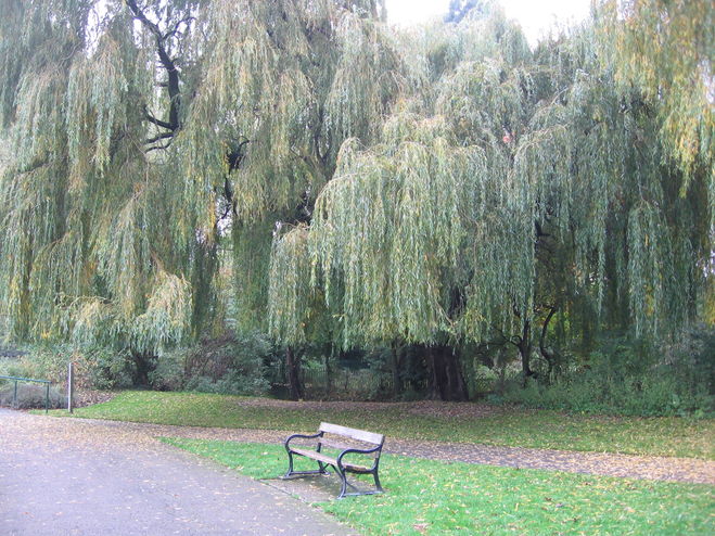 You will soon come to some large Weeping Willow trees and then a bridge on the right. Walk past these to the sign post.