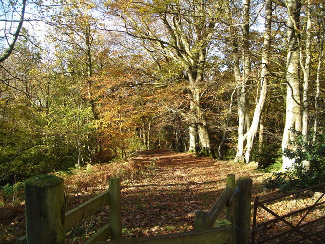 At the fork turn sharp left along a grassy track, following the marker posts. Go through the gate and continue downhill with Blackhouse Burn on your right. The path descends with a line of trees on your right. You reach a wood enclosed by a fence. Carry on down the hill keeping the fence on your right. Go through a gate in the corner of the wood and descend more steeply through the wood to reach a minor road.