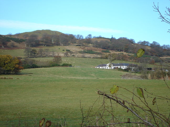 [3] Turn left onto the farm road leading to Brisbane Mains Farm. The farm road crosses a stone bridge and heads for the white building with the prominent archway. Beyond it, and slightly to the left, you can see Knock Hill with its trig point.
