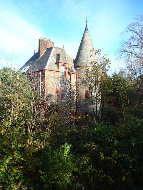 (D) The sandstone building with the turret is the gatehouse of Netherhall, the home of physicist William Thomson from 1875 until his death in 1907. Thomson, a pioneer of thermodynamics and electromagnetic theory, was made Baron Kelvin of Largs in 1892. There is a commemorative blue plaque on the wall.