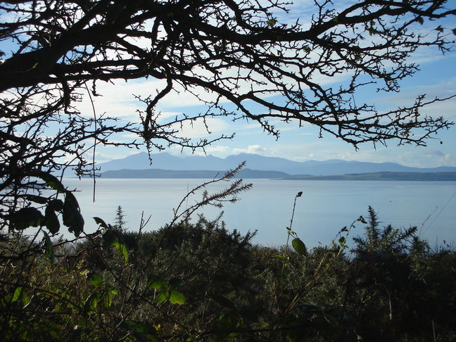 (C) The view from Knock Hill extends from Ailsa Craig in the south, past the islands of Arran, the Cumbraes and Bute, the coastal towns of Rothesay and Dunoon, to the Arrochar Alps on the horizon to the north.