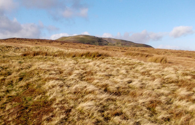 [2] Go straight ahead on a grassy track with wall on the left, at end of wall continue straight ahead, past a cairn on the left until a junction is reached with a track coming in from the right. Go left and follow with a wall coming in on the left.