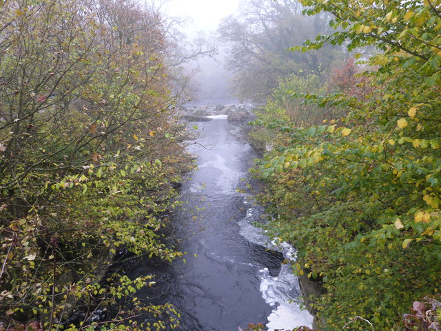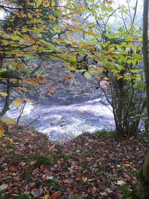 [8] Turn right into the wood on a path just before this junction, and follow the path as it emerges from the wood into a field and continues with the river on your right. Just before a watercourse, bear right down a slope and steps to cross this stream by stepping stones. Follow the path through the river gorge for 1 km and at Abbey Bridge go steeply up the bank to the road at the south end of the bridge.