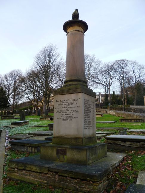 Entering the churchyard through the East Gate which was traditionally the way brides entered the church - the first and most obvious feature is the monument to the seventeen girls who died in a fire at Atkinsons cotton mill at Colne Bridge in 1818. The monument which was restored to mark the Centenary of the Trades Union Congress in 1968 (see photo), tells the full story but don't forget to look for the gravestone itself at the foot of the monument with its sad inscription: