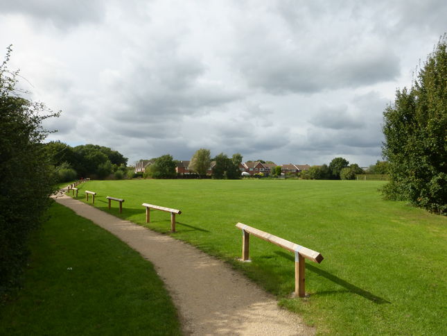 [4] After about 200 metres take the path through the green space.  Continue forward and take the footpath in the corner, just off to the right.   Turn left onto Garendon Way.  Turn left at the 'T' junction and follow Oakmeadow Way around to the right.   Take the footpath in the right-hand corner to access Beacon Field and continue forward past Lady Jane Grey School to the top of Budgens' car park. Turn left into Pymm Lee Lane and then immediately right onto Pine Tree Avenue.