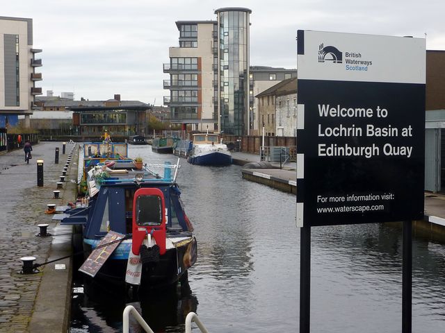 [1] Edinburgh Quay, the start of the towpath, is accessed via the walkway between the Cargo Pub & Edinburgh Quay Building located on Fountainbridge junction Gardner's Crescent. The continuous towpath is on the right hand side of canal leaving Edinburgh Quay. At Lochrin Basin take time to investigate the Leamington Lift Bridge. Continue along the towpath, and go over the aqua bridge which crosses Lanark Road, and continue until you reach the large aqua bridge over the Water of Leith. Before crossing this aqua bridge take the path and steps on the right down to the Water of Leith Visitor Centre (sign-posted). At the bottom of the steps turn left and the visitor centre is 150 yards along this path. After your visit to the Centre retrace your steps back onto canal towpath.
