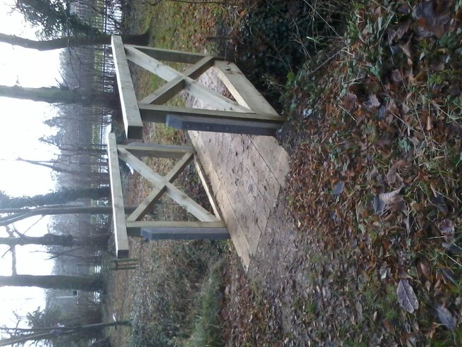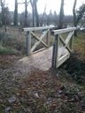 [6] At waypoint 6, just after the wooden bridge, take the path to the left, keeping to the boundary path. You should see a wooden bridge in the glade if you are on the right track - see picture. Notice the rows of bird nesting boxes in the glade.