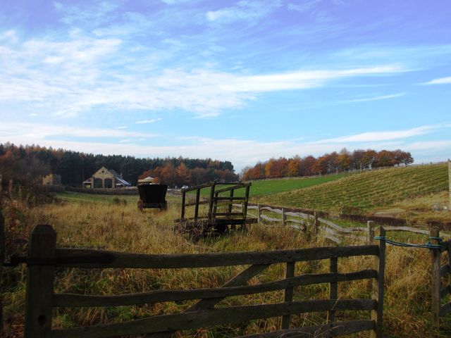 [5] On your left you will see parts of Beamish Museum. You will reach another junction, the left path leads to a church which belongs to the museum and uphill you can see Pockerley Farm. Turn right here to walk towards Flint Mill. Ignore the paths leading you away from the houses. Walk directly past the houses. At the last house, in the left corner, you will see a small sign and stile.