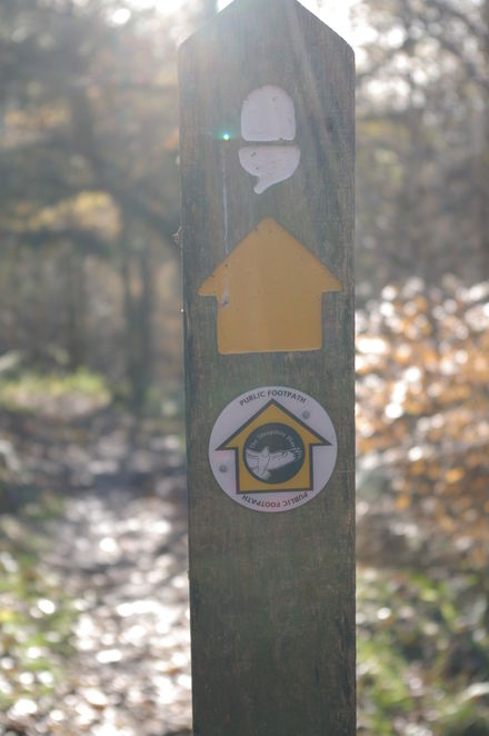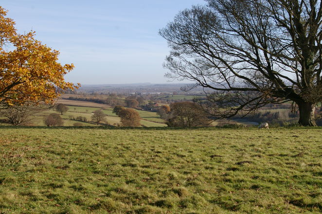 Head south along the racecourse past the grandstand towards a two headed horse sculpture (entitled Janus). Then take the Offa’s Dyke Path (symbol: an acorn) and Shropshire Way (symbol a Buzzard) past the sculpture and over the stile by the side of the gate to go down into the woods. On leaving the woods you will find a meadow on your left and magnificent views over the Shropshire plain including views of Rodney’s Pillar and The Wrekin. Continue on the Offa’s Dyke Path past the meadow and head down into the woods. At the waymark post just after the entrance to the woods continue along the Offa’s Dyke Path. After a couple of minutes walk you will see the remains of a dry stone wall. Turn left for a few metres and you will find another path marker. Continue to follow the Offa’s Dyke Path/Shropshire Way with a right turn followed in a few metres with a left turn (GR 255298).