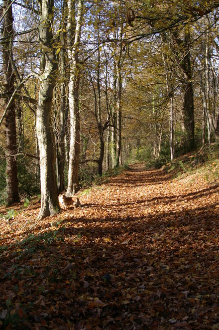 [9] Go through the gate. then go straight ahead through the wood down through the avenue of the trees until you encounter a broad track (Offa’s Dyke Path) that you went down on the outward leg of the walk in step 1. Turn right to return to the start of the walk passing the Janus horse sculpture and the ruins of the grandstand.