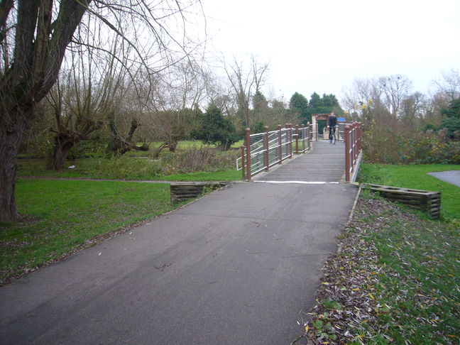 [4] The gate gives access to 'Paradise Nature Reserve'. The path through the reserve follows the river. On passing a small car park, take a right turn on a path that crosses two footbridges (photo 9).