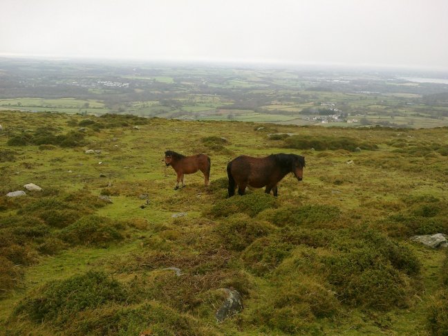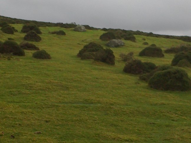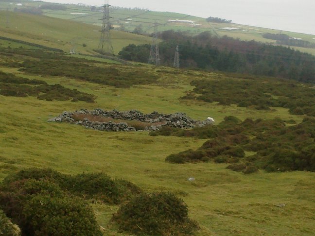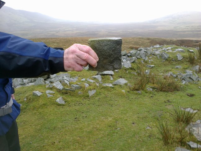 At the summit there is a stone shelter surrounding the remains of a Trig Point. Continue ahead along the well defined footpath going slightly right. This path becomes less distinct eventually disappearing altogether. Continue on your existing line, passing a patch of rushes to reach a more distinct path alongside a ditch. This is the public right of way indicated on the map.