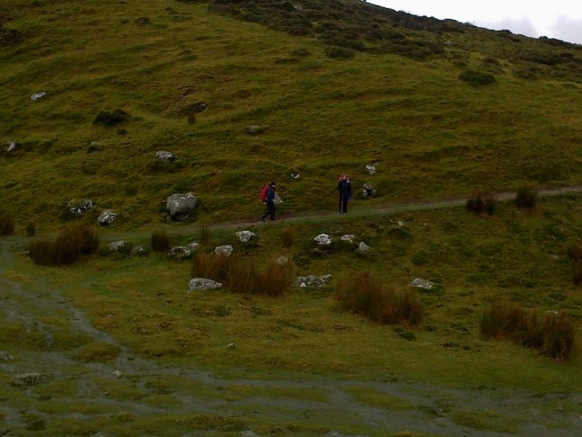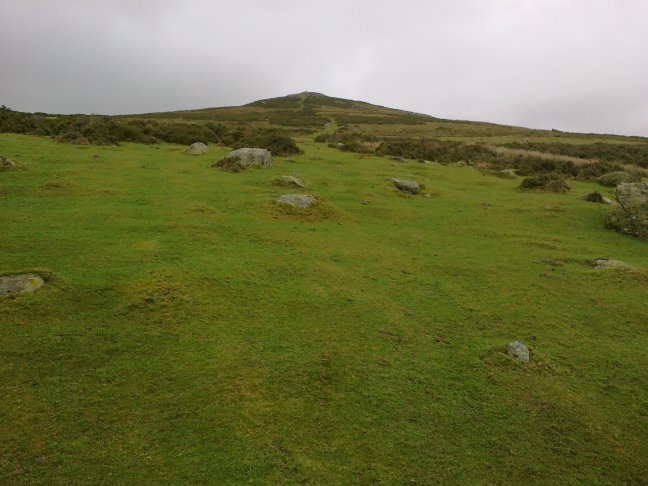[6] With your back to the stile you can see a well defined footpath going between two stones across the side of the mountain. Follow this path ahead and across another distinct footpath going left to right downhill. After crossing this path, continue in roughly a straight line.
