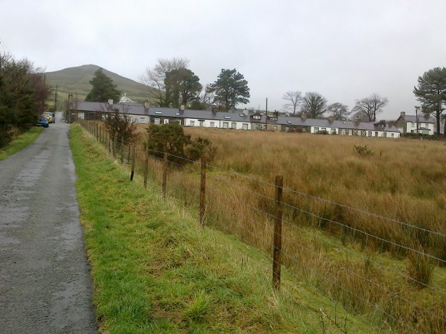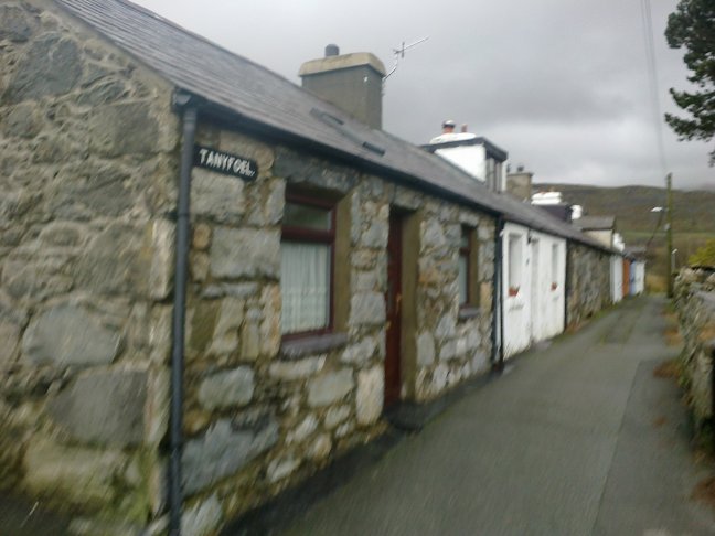 With your back to the Memorial turn right and walk away down the High Street. Take the first road, Penybryn, on the right. At the mini roundabout take the left fork - signposted Ysgol Penybryn . Go past the school,on your right, to arrive at Penybryn Place - a wide space with much red road markings. Where the main road bends to the left turn right into Frydlas Road. Almost immediately turn left up the steps at the footpath sign. Continue to the next road. Turn right and then left up Cilfodan Terrace. Follow this road as it climbs steadily going first left then right. The road narrows passing the low terraced houses at Tanyfoel. Continue until you reach open country.
