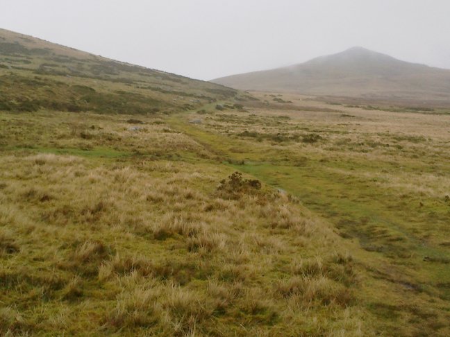 You join a green track which goes diagonally right where before becoming stony and crossing a stream. Leave the track at this point going off left along a faint footpath. This path quickly becomes more distinct. The next section is likely to be wet and muddy with small streams crossing the path. Go down into a small gully and cross a stream. Continue towards the corner of the wall ahead. The path now curves left, then bends right. As you come out of these bends leave the main footpath and take the fainter footpath going left slightly uphill.