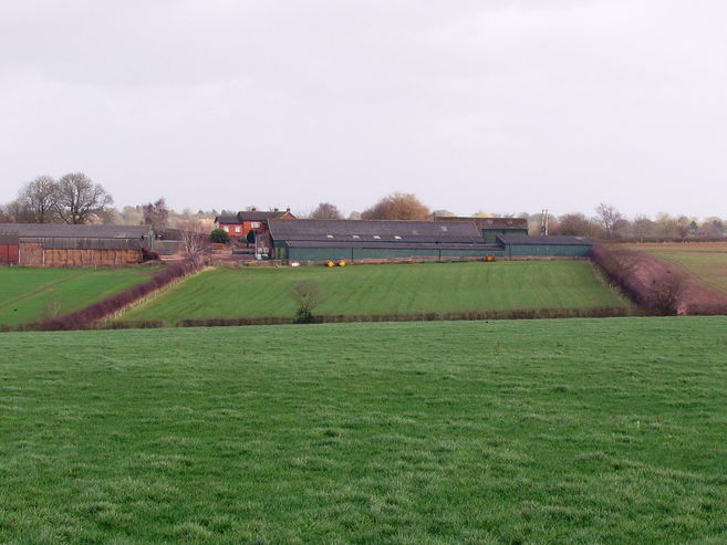 Knightley Eaves Farm. Where the right-hand hedge meets the cross-hedge in the dip, there is a stile.