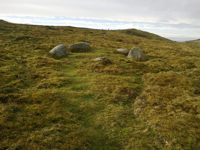 [6] Leave the smaller of the two large stone circles (probably a burial chamber) by continuing ahead along a sunken green path. When you join the broader North Wales Path/Coast Path turn sharply right. You are now effectively walking back.