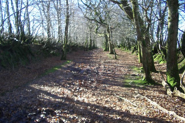 After passing the pond on your right, bear right to follow the wide track or fire break over to a metalled road and turn left along the road to a “Two Moors Way” finger post.