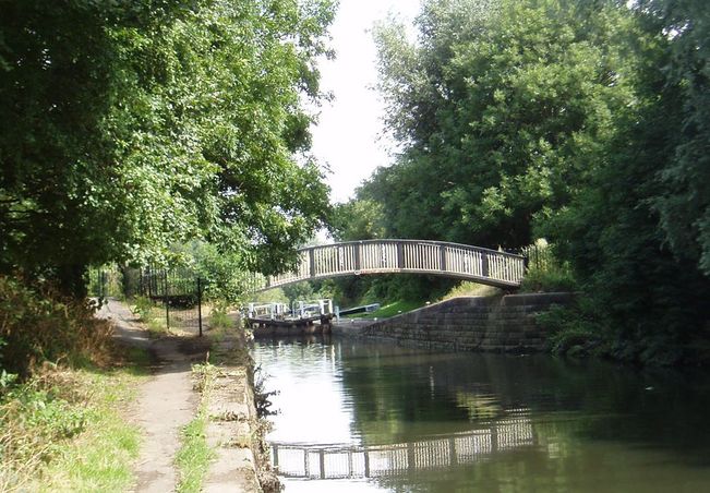 [3]  Turn left just past the bridge and take either the steps or the slope onto the canal towpath.  Turn left and take the path to walk under Abbey Park road.  Continue along the towpath for nearly 1 kilometre to eventually cross the canal using Swans Nest Bridge.  Turn left to walk past the North Lock and continue forward  to the pedestrian suspension footbridge.