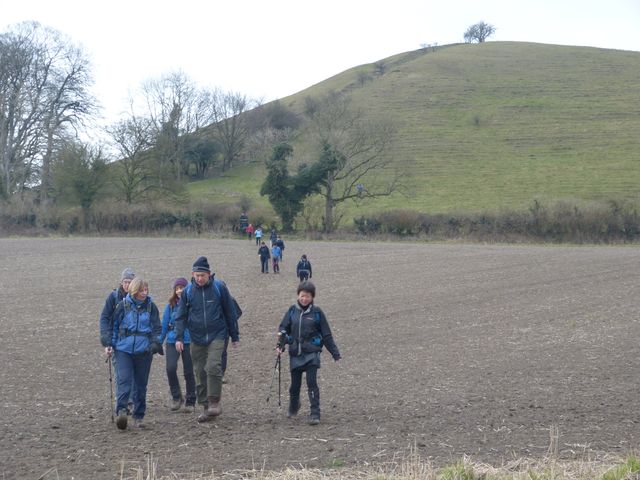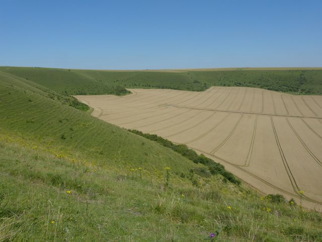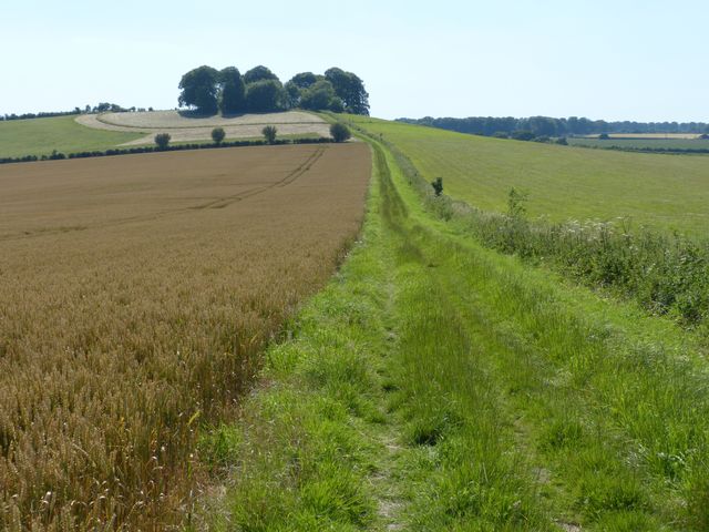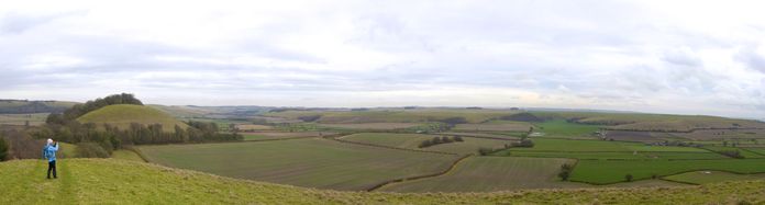 [4] Go through the gate to the airfield then immediately turn sharp left to descend along the fence to a metal gate. Go through, turn right, and follow the path, keeping the fence on your right. There are good views of the River Wylye valley below. Pass left of a small pheasant spinney then walk just below and left of a wood, and shortly after a tumulus, as views of Kingston Deverill church and village appear, with Cold Kitchen Hill above and behind.