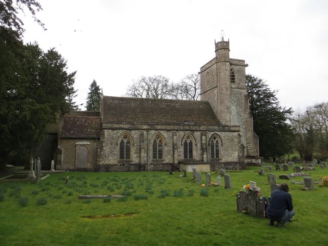 [5] The path descends steadily to a gate. Turn left into a lane, and immediately right through a pair of gates. Cross the field ahead diagonally left and through another gate, then turn left for 20 meters on tarmac then right at the T junction towards the church. After 100 meters fork left to walk past a wide stretch of the river with ducks, geese, swans. At the next road, don't cross the bridge but instead turn right and then immediately right through black wrought-iron gates to pass left of house No. 36 and between two small fields to the church.