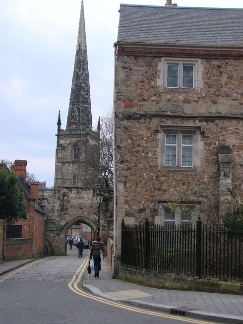 (I) The Newarke ("New Work") was a religious precinct laid out in the fourteenth century. There was a large church, the only remains of it are a few stones in the basement of the Hawthorn Building of De Montfort University. There were two gateways to the precinct, only one survives and that is the Magazine Gateway which you can see on your right, built in 1410. The Newarke Houses Museum is composed of Wyggeston's Chantry House (the stone house) built about 1511 and Skeffington House built in 1600. Both have been altered over the years. The Museum has free entry and among the exhibits are Daniel Lambert's clothes.
