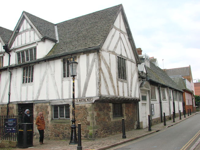 [14] Walk along the pavement of St Nicholas Place. At the High Street turn right and walk with BBC Radio Leicester on your left and an open-air car park on your right. Turn left down Guildhall Lane. Take the first right along St Martins West with the Cathedral on your left and the Guildhall on your right. Take the gate through the car park of St Martins House.