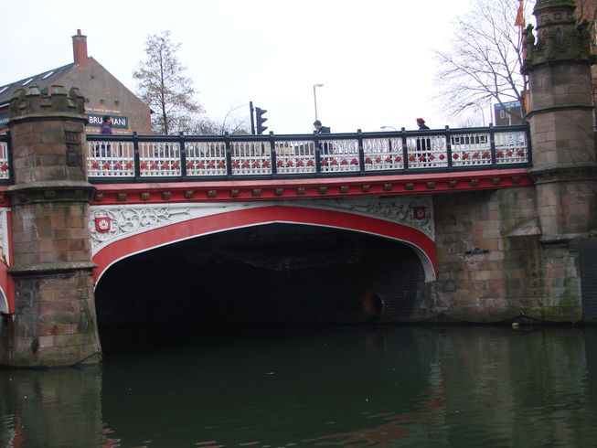 [10] When Castle Gardens is reached on your right turn right into the Gardens and walk northwards parallel to the river with the Castle Mound on your right. This part of the river has been "canalised" so is also the Grand Union Canal. It is known as "Mile Straight". Turn left when you reach the pedestrian bridge over the river, go over the bridge turn right and walk down the steps to the right. At the towpath turn left and continue walking northwards towards West Bridge, go under bridge and continue on towpath.