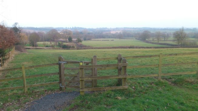 Follow the gravel path to the right, past Nick Drake's grave, down to the bottom of the churchyard. When the gravel path ends at a gate continue ahead down the left edge of the field to a road.