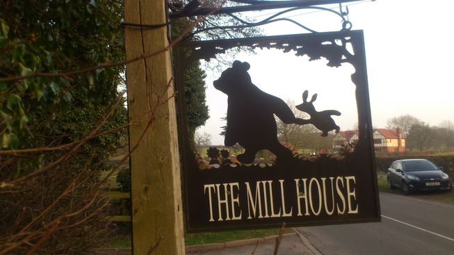 [3] Turn left, and take a path on the right when the road swings left. Go uphill half left to a gap in the hedge. Continue in the same direction and downhill across the field. Pass between two dead trees and then look carefully for a stile in a gap in the hedge. Cross it and follow the path ahead to a gate & stile on the right. Go through and cross the dam of the old mill pond (which is now drained and to your right). Keep right of the mill buildings (now a house) and follow the drive down to the road. (Look out for Winnie the Pooh and Piglet on the house sign!)