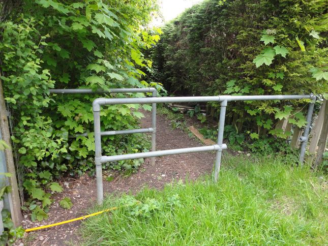 [3] Turn right just after The Harvesters pub and follow the lane to a footpath (with a Scout Hut on the right.) Continue through a narrow zigzag metal barrier (2 ft wide - see photo) to reach an open space.