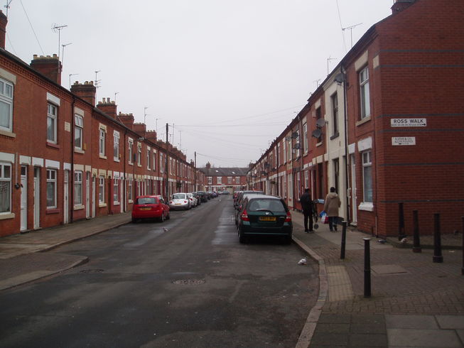 (E) Many of the houses in the streets to the left are late-Victorian being built in the 1890. These would have been homes for the working class who were employed in the hosiery, footwear and related industries. The Vinola knitwear factory (Reliance Works of 1901) still provides employment.