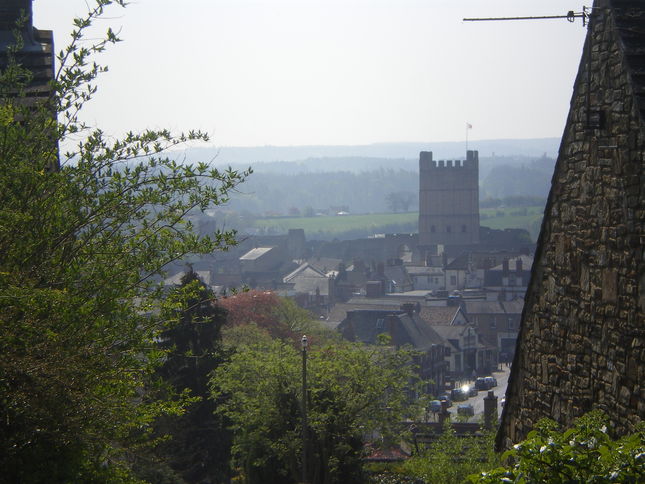 [6] Cross straight over road (care needed) and go through a gap opposite on a signed footpath. Bear half left and head for a gap in the wall on the horizon ignoring other more well walked paths. Go through this and follow the footpath through 3 fields going diagonally left. Exit onto a road (care needed) and turn left along the pavement for 100m. Turn right through the wall and follow a walled footpath downhill, crossing one road (cul de sac) and exiting above some steps. Cross the road (care needed) and go straight ahead into the centre of Richmond passing 2 roundabouts and a small park on your right.