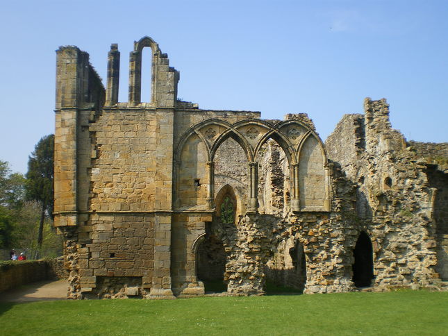 [8] Turn right (signpost to Easby Abbey) and follow a track as it rises and then descends in a wood, which falls steeply to the river. Where the path divides, take the right hand fork, passing large black metal gates on your left, down to the riverbank. Follow riverside path to a flight of steps. Climb these, turning right at top and exit into a field via gate. Turn sharp right alongside the fence to exit the field before a house. Continue along footpath then track with the house on your left to reach Easby Abbey (G).