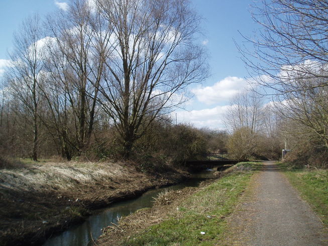 [4] Just past the Hino trucks depot turn right onto the footpath next to the stream and follow it all the way to the River Soar