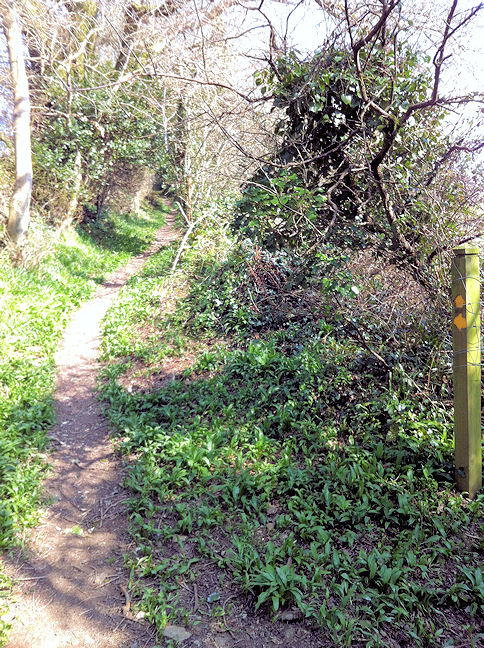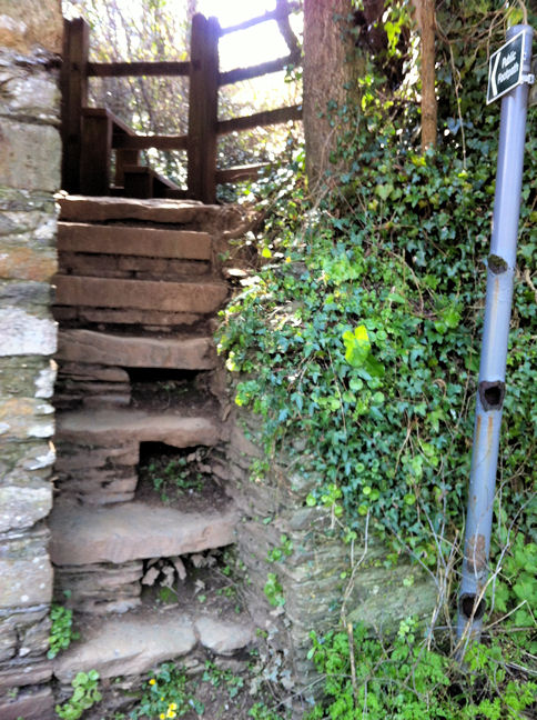 [4] Go along the Public Footpath, past a Public Footpath off to the right that goes over a boardwalk, to its junction with another Public Footpath. At that junction turn left and go up a sunken lane to a gate into a field. Keep to the left hand side of that field and go to a stile. From the stile the Public Footpath goes diagonally right, across the field to a track near the hedge leading to a stile at the field’s far corner. From that stile continue on along the next field’s left-hand edge to another stile. Then initially go along the next field’s left-hand edge, then straight on across the field, soon going downhill, to a stile and steep steps leading onto the minor road at the rear of the Latchbrook Cottages.