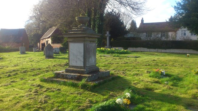 [1] From the telephone box on the village green, go up Church Hill, noting the information board about Joseph Elkington mounted on the village hall on your left. Turn left through a gate into the churchyard, then right up a path starting opposite the tower door up to a gate leading onto the road. Joseph Elkington's memorial is on your right as you pass through the churchyard. It is the large one with a stone vase on top. Feel free to take a closer look. He was buried in Madeley, Staffordshire, so this is a memorial rather than a grave.