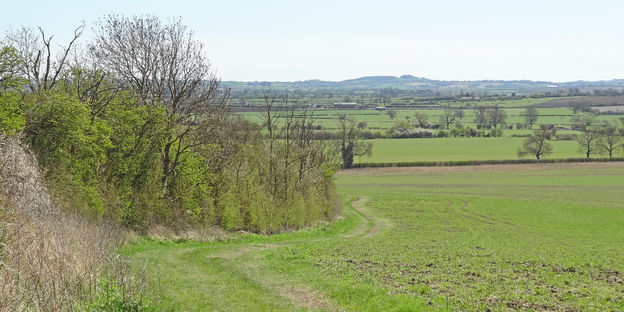 [4] Go through a gate into the churchyard and walk along an avenue of yew trees to the right of the church. The church of St Peter dates from the fourteenth century. Emerging at the main gates to the churchyard you carry straight on along the side road of a small triangle and turn left into Main Street. At the T junction, you can turn left to find the Shoulder Of Mutton pub if you require refreshments, but to follow the route, turn right along Hill Road and bear right again at the next junction. Follow the road for 400 metres as it continues in a steady direction. When the road makes a sharp turn to the left carry straight on along a farm track with a footpath waymark. This track is easy to follow as it continues in the same direction for a kilometre, gradually getting smaller and grassier. To your right you have a good view of earlier sections of the walk.