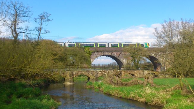 (B) The river Blythe emerges from Earlswood Lakes and winds it way north through the Meriden gap for 24 miles until it joins the River Tame near Coleshill. It is actually a Site Of Special Scientific Interest (SSSI) along most of its length, as it is "a particularly fine example of a lowland river on clay". The water in it is clean and it supports a diverse range of plants and invertebrates. We meet it at this point where it is crossed by the ancient packhorse bridge, and the more recent railway viaduct behind it.