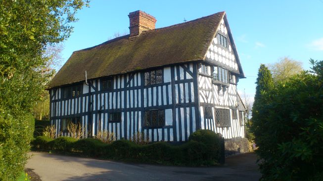 Turn left along the road to a stile on the right just beyond the house. But before crossing it, you may wish to divert slightly ahead along the road to take a closer look at the beautiful 16th Century wooden building, Magpie Farm.